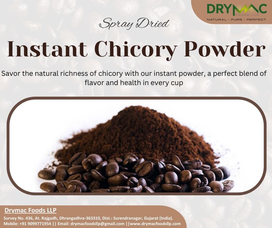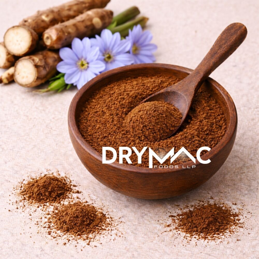 DryMac Foods LLP offers premium quality Instant Chicory Powder, processed from selected chicory roots using advanced extraction and spray drying technology. The powder delivers a rich, roasted flavour profile similar to coffee, with a smooth taste and pleasant aroma, making it an ideal natural coffee substitute or coffee extender.