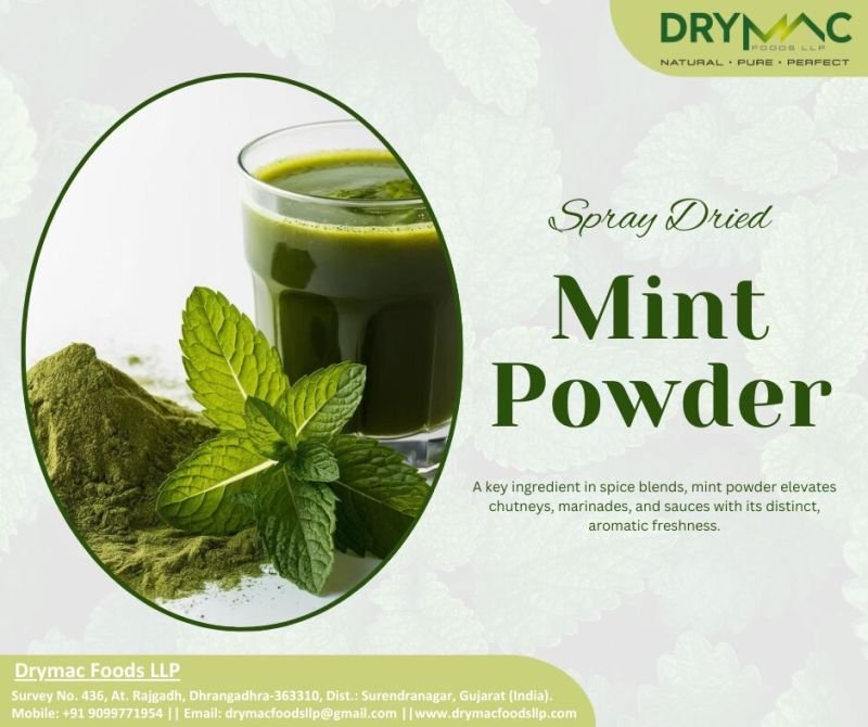 DryMac Foods LLP offers premium quality Spray Dried Mint Powder, produced from fresh, green mint leaves (Mentha species) using advanced spray drying technology. This process helps retain the natural green colour, refreshing aroma, cooling taste, and essential phytonutrients of mint.
